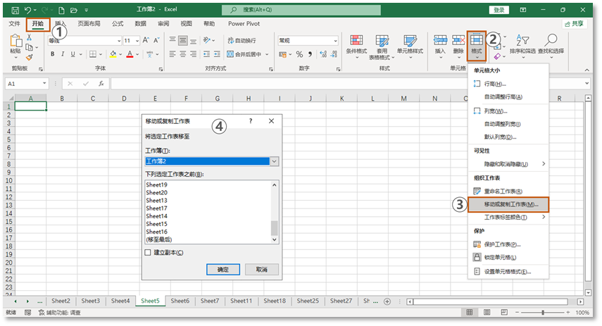 方法2:在【开始】选项卡中,点击【格式】命令,在弹出列表中,单击【移动或复制工作表】命令,进入”移动或复制工作表“对话框操作。