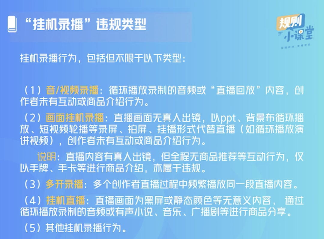 挂机录播是指创作者在直播过程中,用录制音/视频,或长时间无真人出镜、无讲解、无互动的直播进行商品讲解的营销行为。