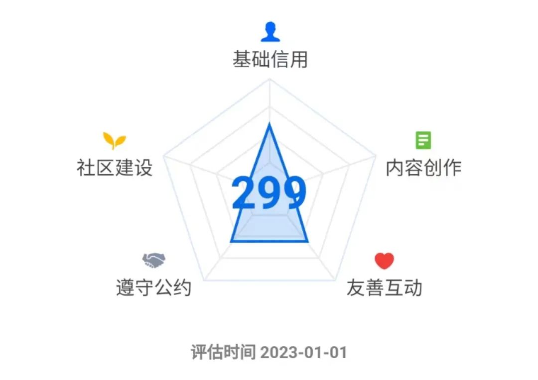 其实“盐值”就是给他起了个名儿而已,核心还是对用户的5个维度的考量,这5个方面包含基础信用内容创作、友善互动、遵守公约、社区建设。