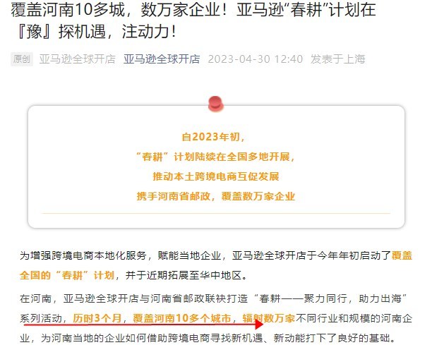 亚马逊全球开店于今年年初启动了覆盖全国的“春耕”计划,并于近期拓展至华中地区。在河南,亚马逊全球开店与河南省邮政联袂打造“春耕——聚力同行,助力出海”系列活动。