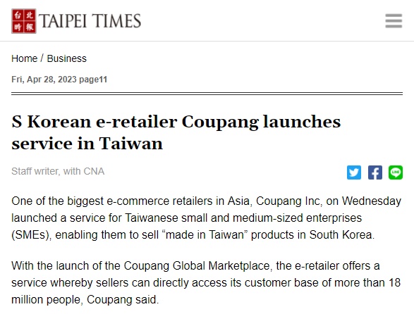 该公司在一份声明中表示:“这是Coupang首次主动与台湾中小企业合作。作为最多韩国人使用的电商应用APP,随着Coupang国际开店的推出,Coupang将为卖家提供直接访问其在韩国超过1800万活跃客户的机会。”