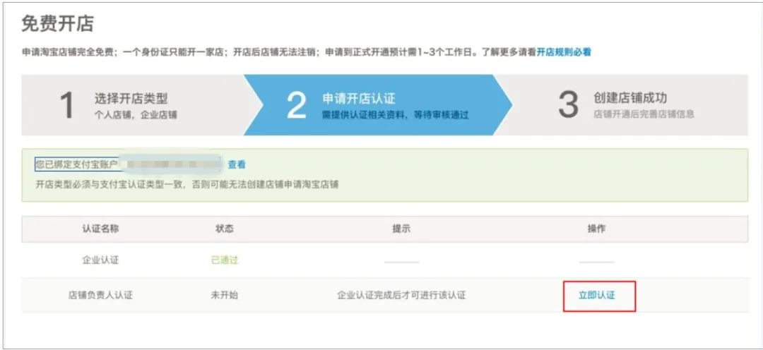 1、完成支付宝实名认证操作之后,点击返回【免费开店】页面时,您可以进行【淘宝企业店铺责任人开店认证】的操作