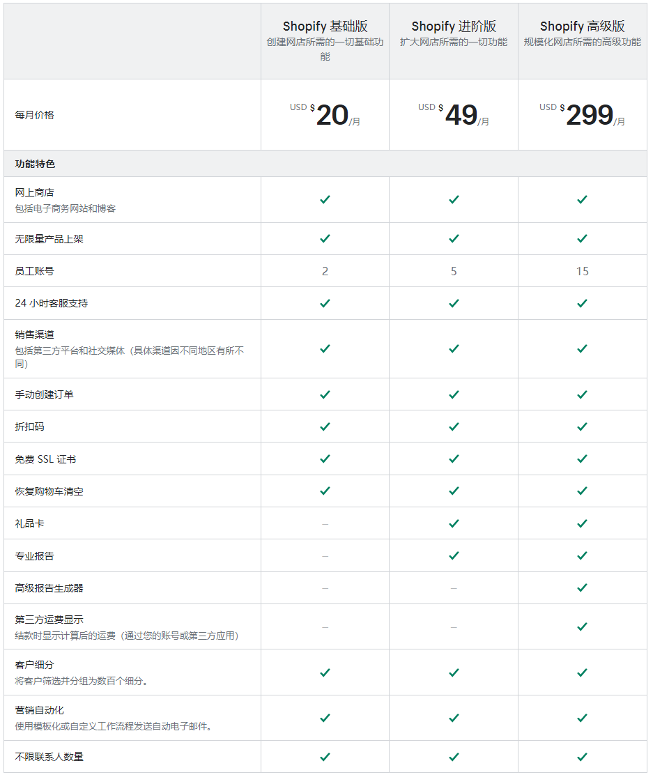 Shopify开店目前主要是3个付费计划(最低 9 USD/月的计划不支持网上商店),大多数卖家都会选择Basic Shopify-29 USD/月,如下图所示,基本的功能已经足够我们前期使用,后续如果有需要升级计划,可以随时进行变更;月租费用在每个月月底在你绑定的信用卡中扣除,当你信用卡账号余额不足,或者你信用卡失效,shopify也会停止网站托管服务。