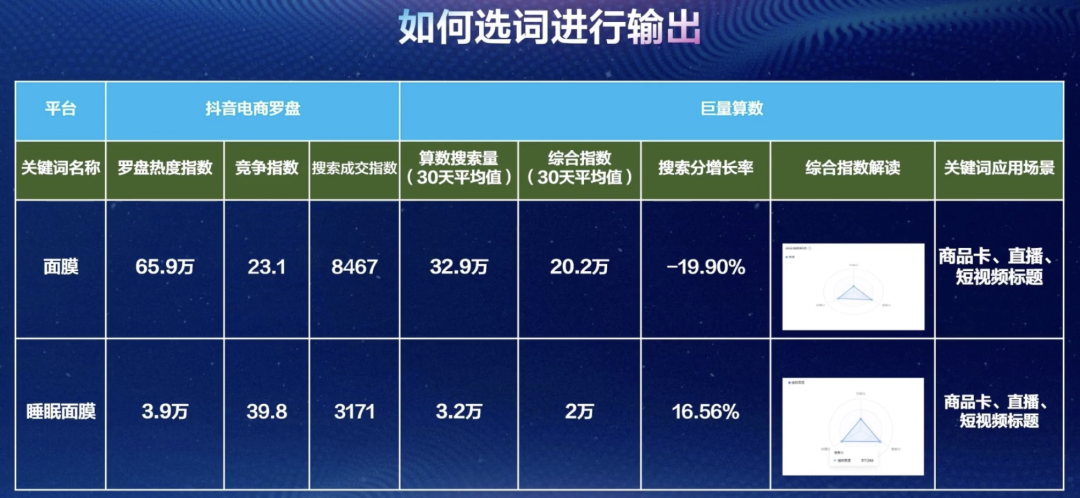 关键词通常包含商品词、品牌词、达人词、兴趣词、营销词等等。关键词不是商家凭空臆想出来的,如何找到关键词,我们要学会善用电商罗盘、巨量千川、巨量算数、抖音热点宝及蝉妈妈这些平台。