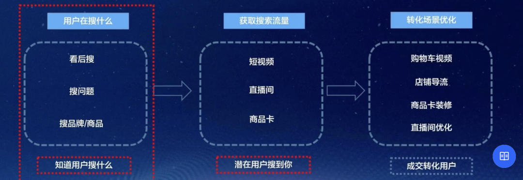 接下去我们就来看看,如何通过短视频、直播间、商品卡三个场景来获取搜索流量,转化用户促进成交。