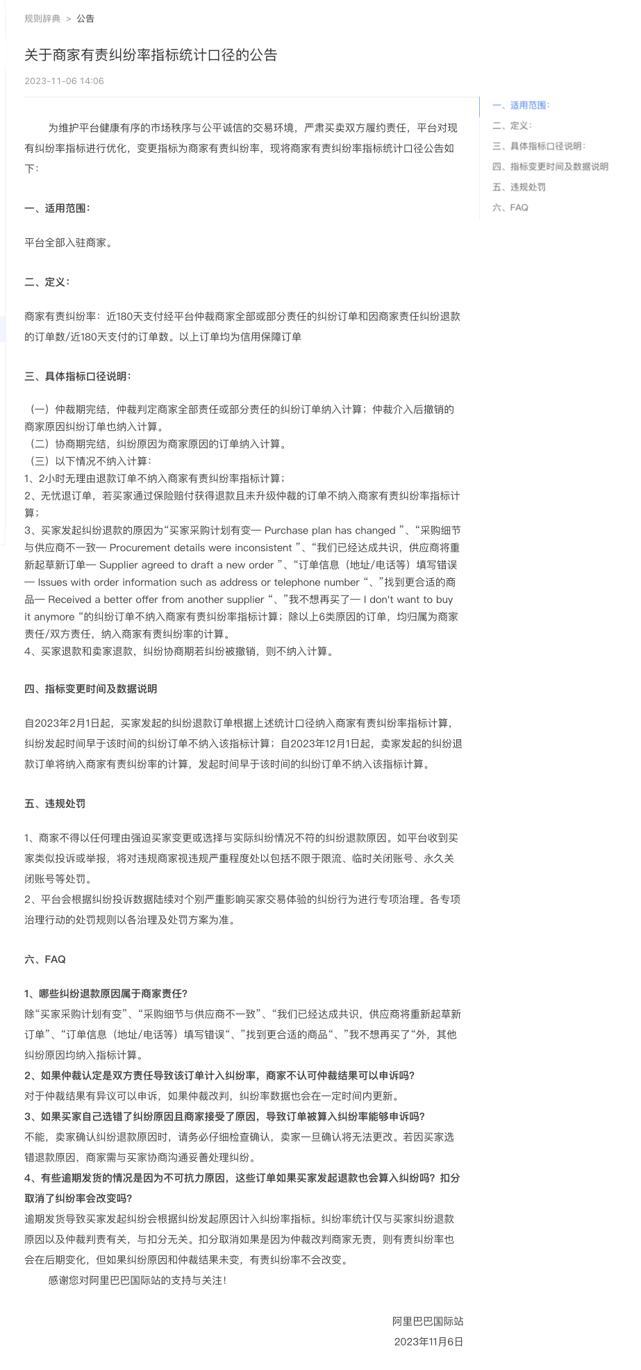 11月10日消息,阿里巴巴国际站发布了关于商家有责纠纷率指标统计口径的公告(以下简称公告)。