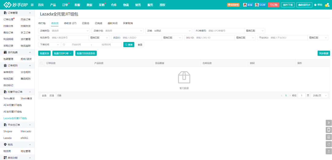 在完成Lazada全托管店铺授权后,卖家可以通过妙手ERP快速实现订单同步、订单打包确认、批量打印PO面单、批量打印货品条码、分拨组包、打印揽收单等一系列高效操作。同时,妙手还支持批量处理订单,极大地提高全托管订单处理的效率。