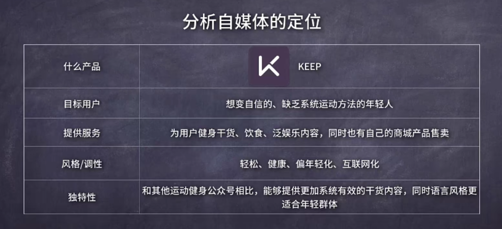 然后分析自媒体公众号keep的定位如下图: