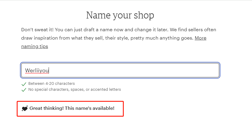 开一个店铺,店名自然是必不可少的,Etsy店名的长度要求是:4—20个字符,不能包含空格或特殊字符,且是独一份,没有其他店铺使用该名字。