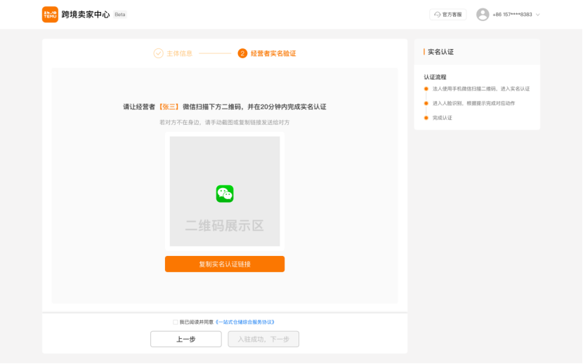 - 正确填写以上信息后,开店人/经营人/法人/董事/管理人进行实名认证,需要使用手机扫描二维码,并根据手机页面提示,完成对应动作,直至手机上提示“实名认证通过”后,在电脑上点击【入驻成功,下一步】,完成认证。