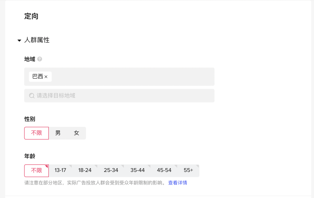 接下来,设置地区,性别,年龄,语言,受众,设备等