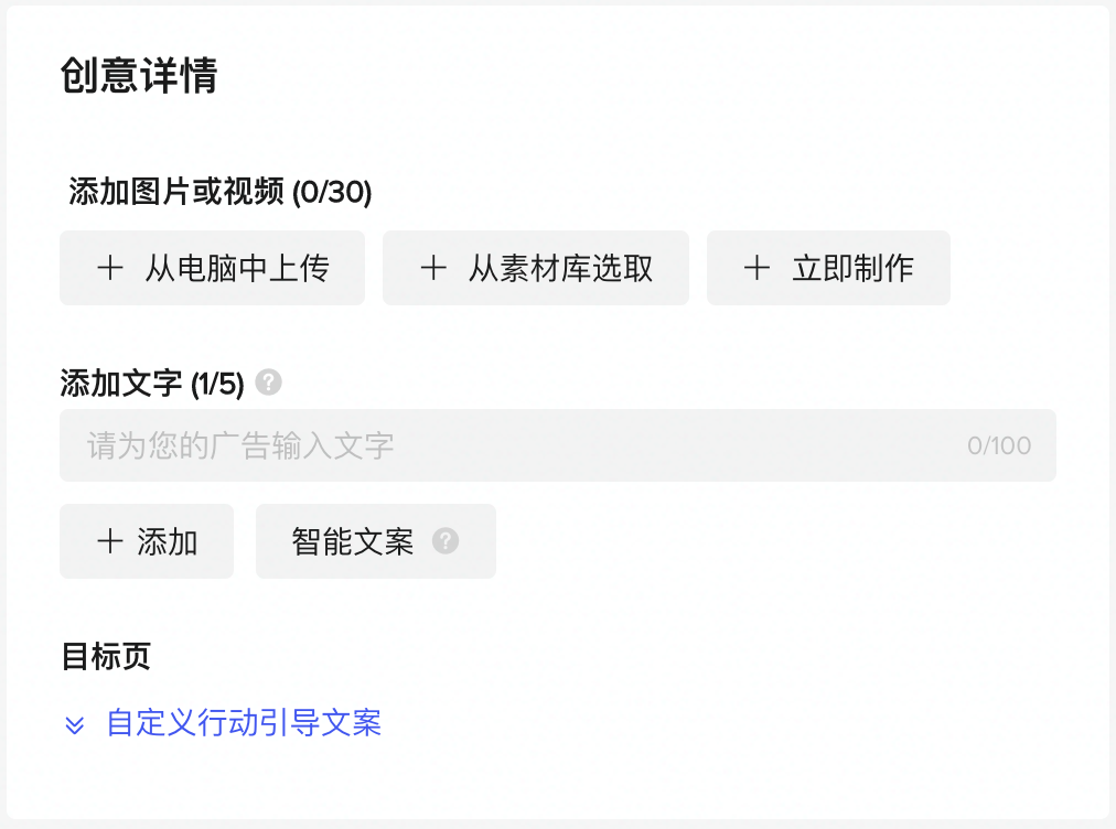 在这里上传或选取素材,设置好广告描述后