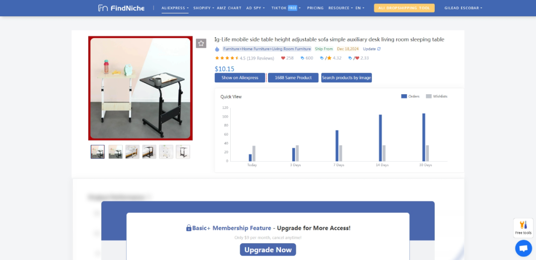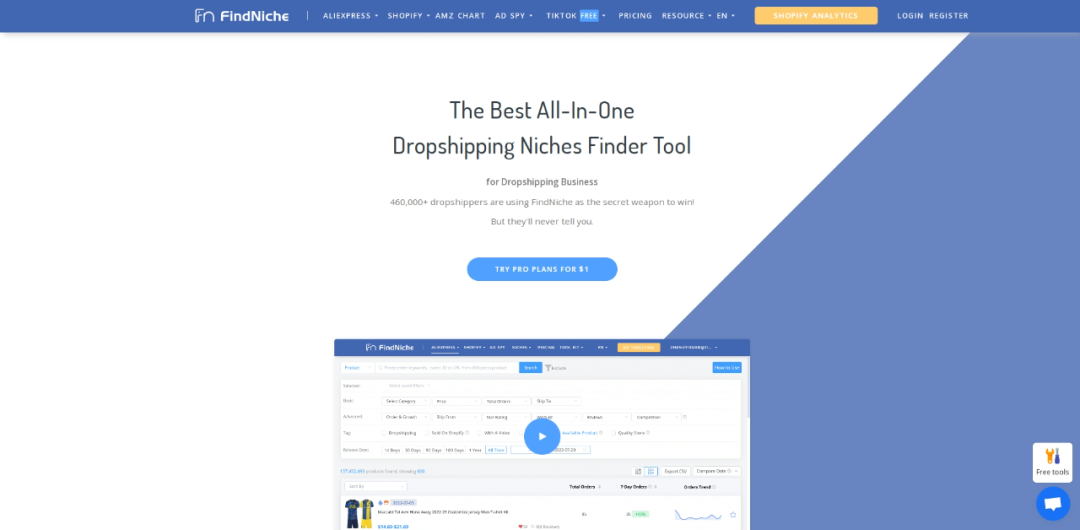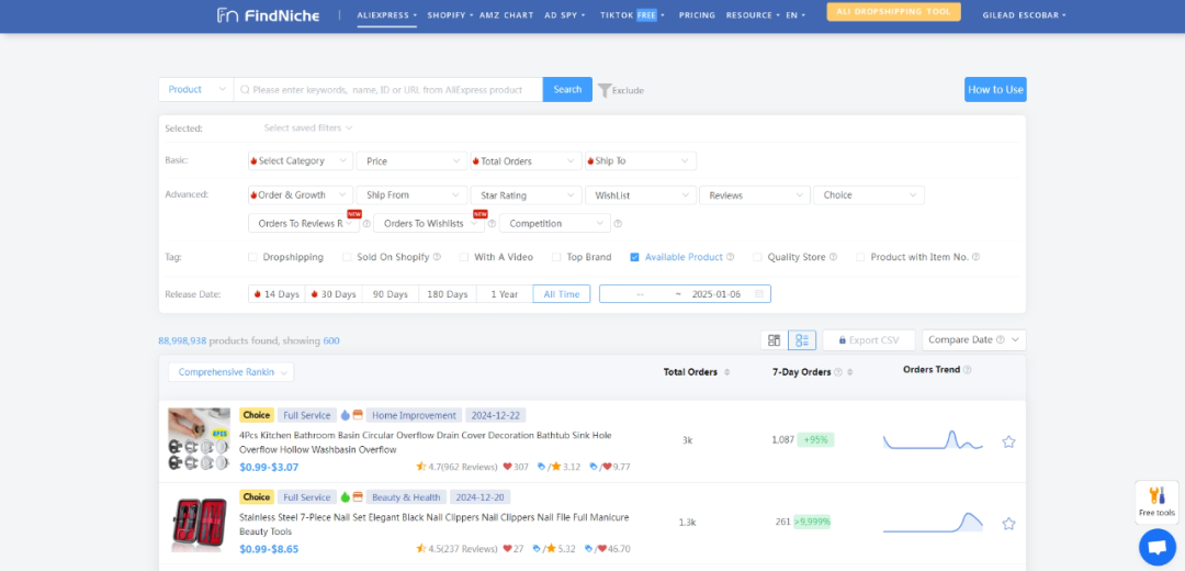FindNiche能智能识别出在速卖通和Shopify上销售额和利润较高的产品,帮助卖家发现有潜力的利基产品。